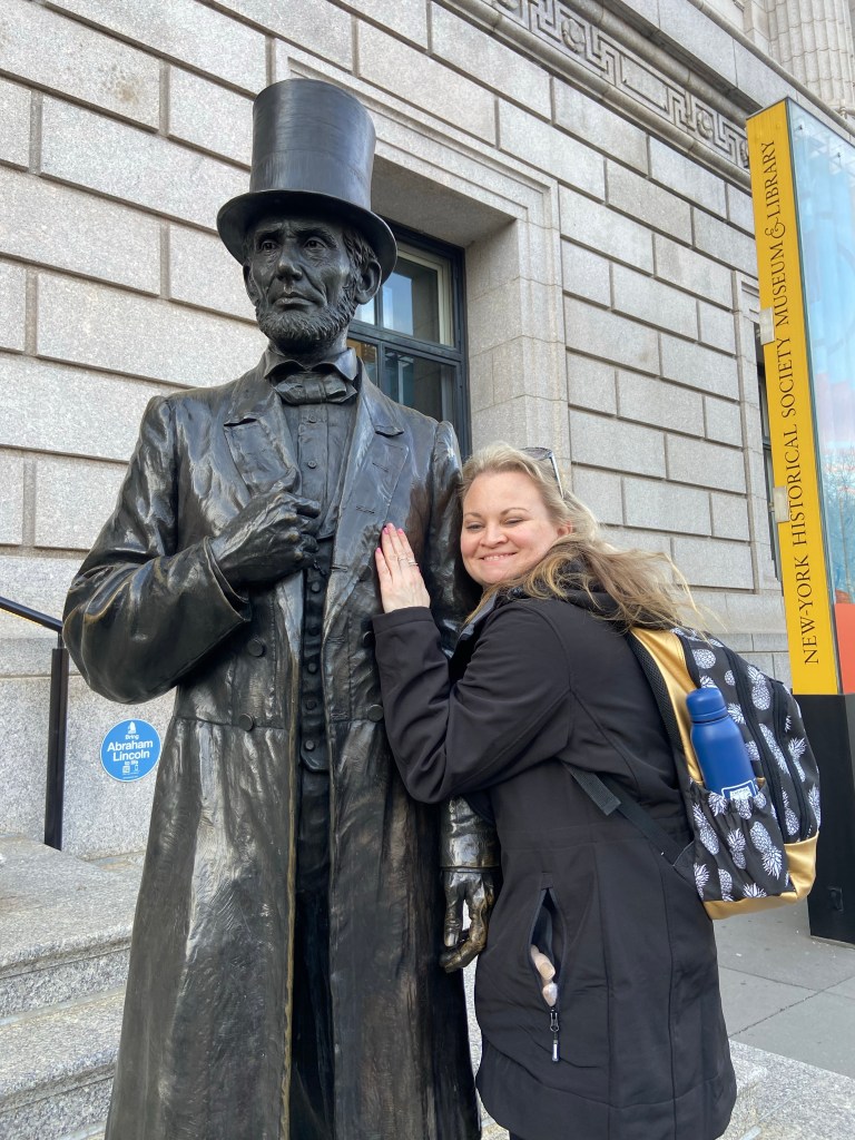 Wednesday started with a little one on one project preparation for the final presentation at the Whitney Museum of Art. Having time to define what our group believes a history museum is was a great interactive experience to see if any ideas had changed or were altered after visiting such a variety of experiences this week. After a small shop pizza for lunchtime treat we walked our way to our final planned museum The New York Historical Society. Many visitors to NY probably assume this is Museum dedicated to the history of the city and it’s surrounding boroughs; however, it showcases the history of America, through current collections of toys, art, popular culture and Tiffany Lamps. The fact that they tell and capture women’s history in the Center for Women’s History sparked early curiosity in the museum for me. The museum itself leaves many places for physical interaction by visitors like in the “I’ll have what she’s having” exhibit with the “sandwich” boards to make photos with or the History of the Presidency exhibit where you too can sit in the Oval Office on a replica presidential desk. Overall the museum provided such unique spaces for the young and old.